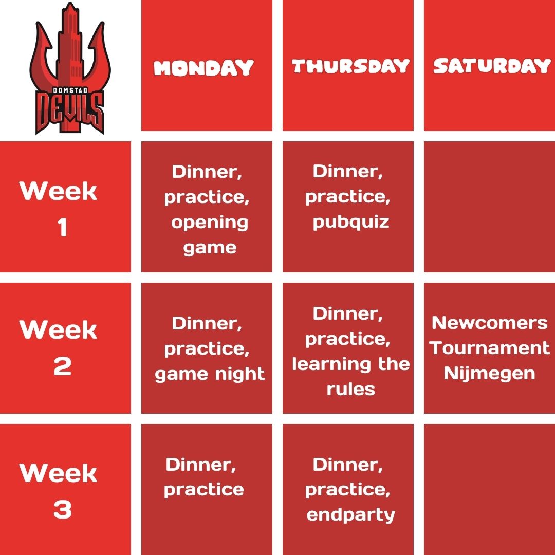 Gedurende drie weken train je twee keer per week; dinsdag en donderdag van 19:30-21:00, en op 21 september is het grote Newcomers Tournament.